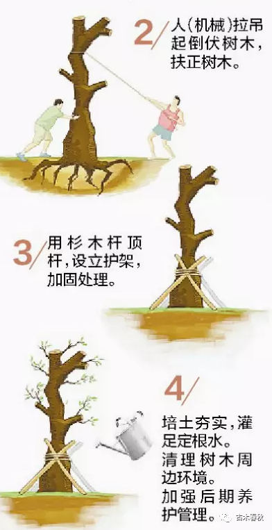 一、排積水:因臺(tái)風(fēng)的作用使得古樹(shù)伏倒并受淹的古樹(shù)應(yīng)及時(shí)進(jìn)行排水,確保根系正常呼吸。